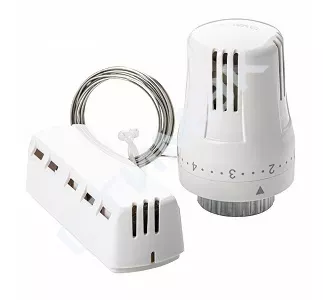 Жидкостная термостатическая головка с настенным датчиком предназначена для поддержания в помещении требуемой температуры воздуха путём регулирования расхода теплоносителя через отопительный прибор. Термочувствительный элемент предназначен для настенного крепления и соединен с термоголовкой капиллярной трубкой. Данное решение применяется в тех случаях, когда термоголовка установлена за плотной шторой, в нише, за экраном и температура воздуха вокруг неё не соответствует средней температуре воздуха в помещении.