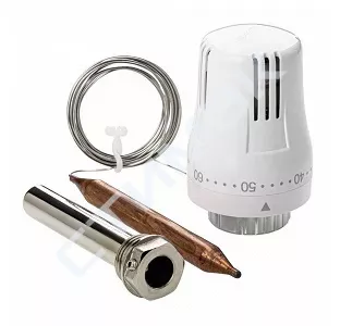 Жидкостная термостатическая головка с выносным погружным датчиком предназначена для поддержания требуемой температуры теплоносителя путём регулирования его расхода через термостатический клапан (двух- или трехходовой). Выносной датчик соединен с термоголовкой капиллярной трубкой. Датчик устанавливают в латунную гильзу (входит в компл. поставки) с наружной резьбой на 1/2". Заданное значение температуры воздуха устанавливается в диапазоне от 20 до 60°С.