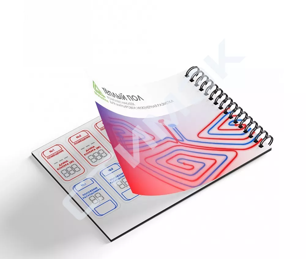 Комплект маркировочных наклеек для тёплого пола. Он состоит из альбома с наклейками, которые позволяют промаркировать отдельные контуры при разводке тёплых полов. Наклейки размещаются на защитных сантехнических втулках. Наклейки изготовлены из высококачественного, прочного и водостойкого материала, поставляются в буклете для удобного хранения.