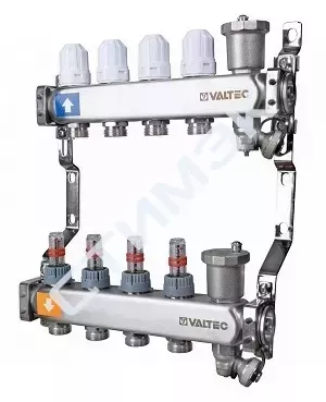 Выходы обратного коллектора блока VTс.579 оборудованы регулирующими клапанами с возможностью установки электротермических сервоприводов, подающего – настроечными клапанами с расходомерами (ротаметрами). Коллекторы оснащены автоматическими воздухоотводчиками и дренажными кранами. В комплект входит пара сдвоенных кронштейнов с двумя комплектами хомутов.