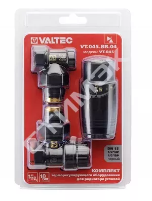 Набор предназначен для поддержания в помещении требуемой температуры воздуха путём регулирования расхода теплоносителя через отопительный прибор, а также для его гидравлической увязки. Комплект помещен в пылевлагозащитную упаковку (блистер).