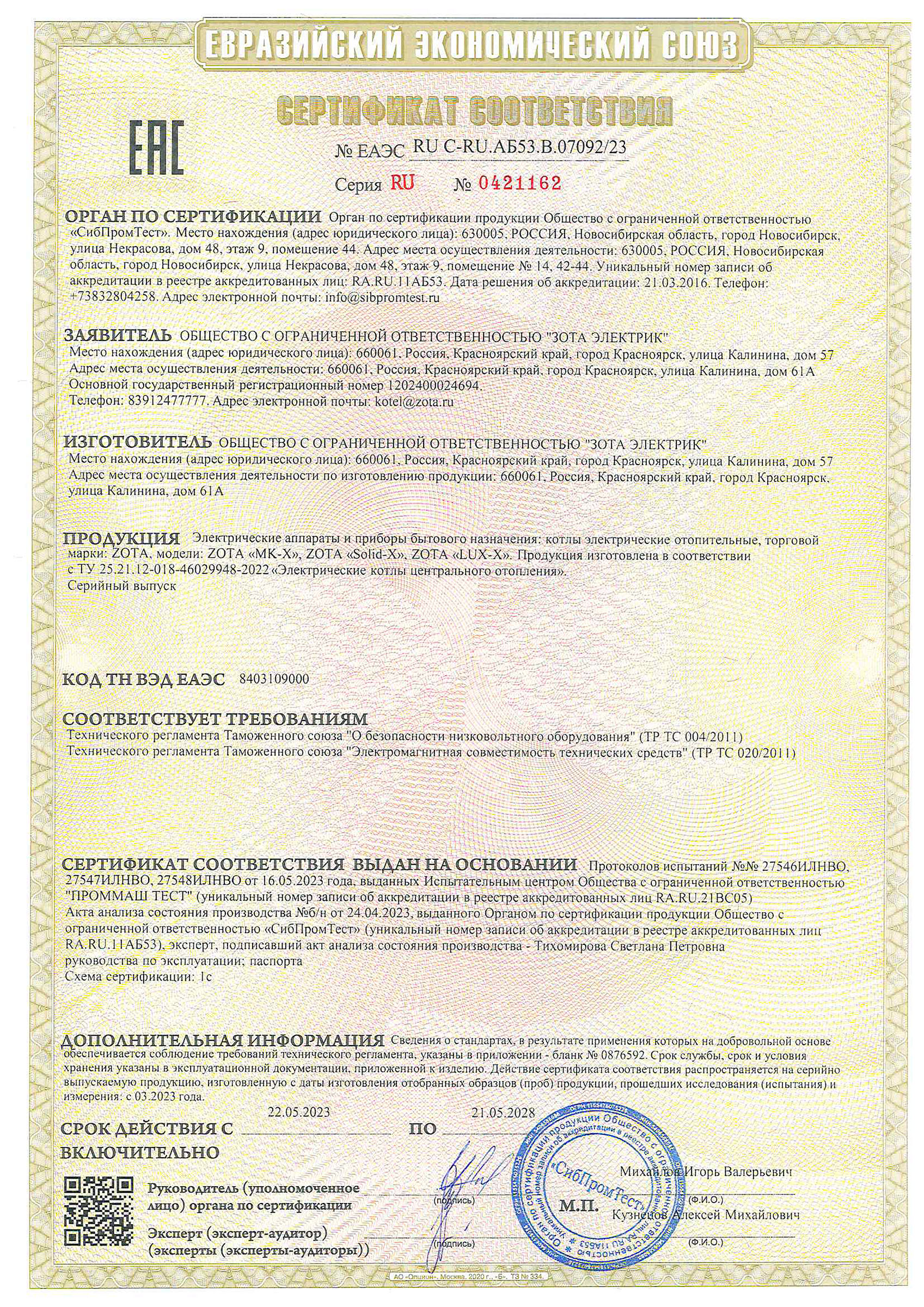 Сертификат соответствия Котлы электрические отопительные MK-X, SOLID-X, LUX-X ZOTA