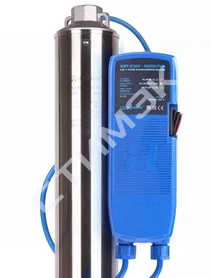 комплектация внешним защитным блоком с функцией плавного пуска, защиты от перегрузки двигателя, защиты от низкого и высокого напряжения в сети