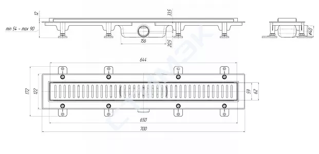 Трап линейный пластиковый выпуск 40 мм решётка Бимс матовая нерж. сталь 650 мм TL1465M АНИ пласт TL1465M